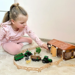 The Woopie Little Farmer XL set brings children a realistic world of farming. Thanks to the wide range of animal figures, farmers, tractors with detachable trailers, and enclosures, children can easily build their own farm and dive into imaginative storytelling. Smooth surfaces and no sharp edges ensure pleasant and safe play.