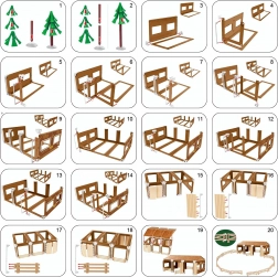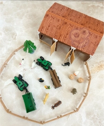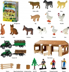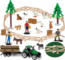 - 12 animal figures, 3 human figures, 2 tractors with detachable trailers, barn/zagroda, enclosures, and other farm accessories