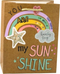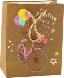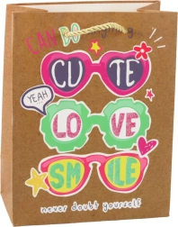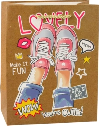 The bag features four different designs, each captivating with vibrant colors and positive slogans that highlight its youthful and optimistic character. Strong rope handles ensure comfortable carrying and are color-coordinated with the design. With dimensions of 23 x 18 x 10.5 cm, it's ideal for wrapping medium and smaller gifts such as cosmetics, accessories, books, or sweets.