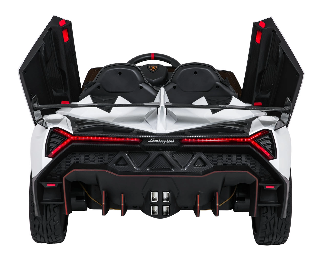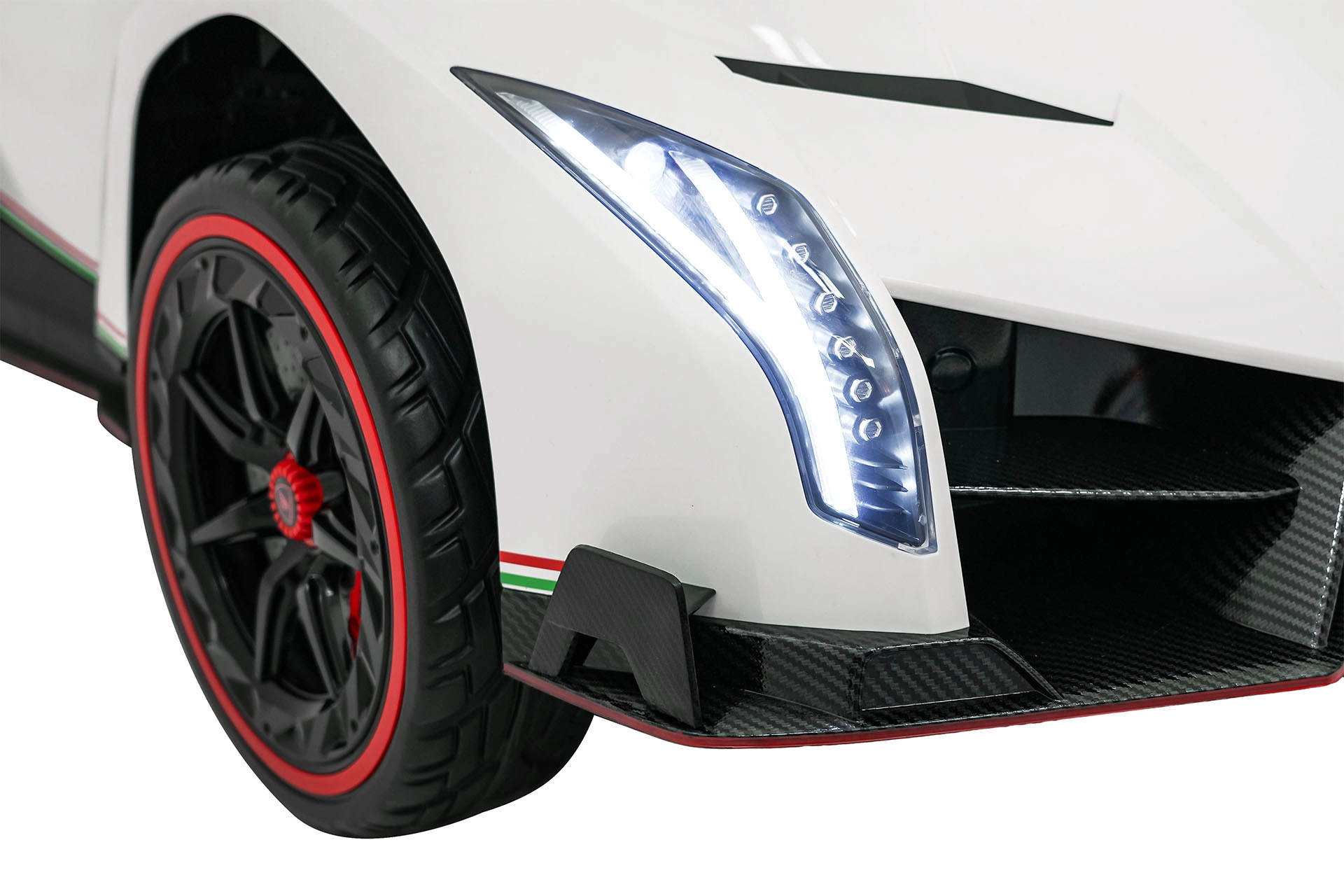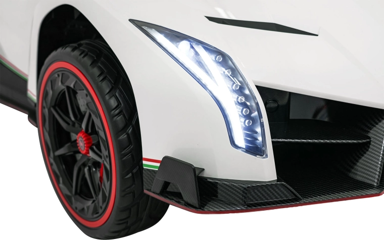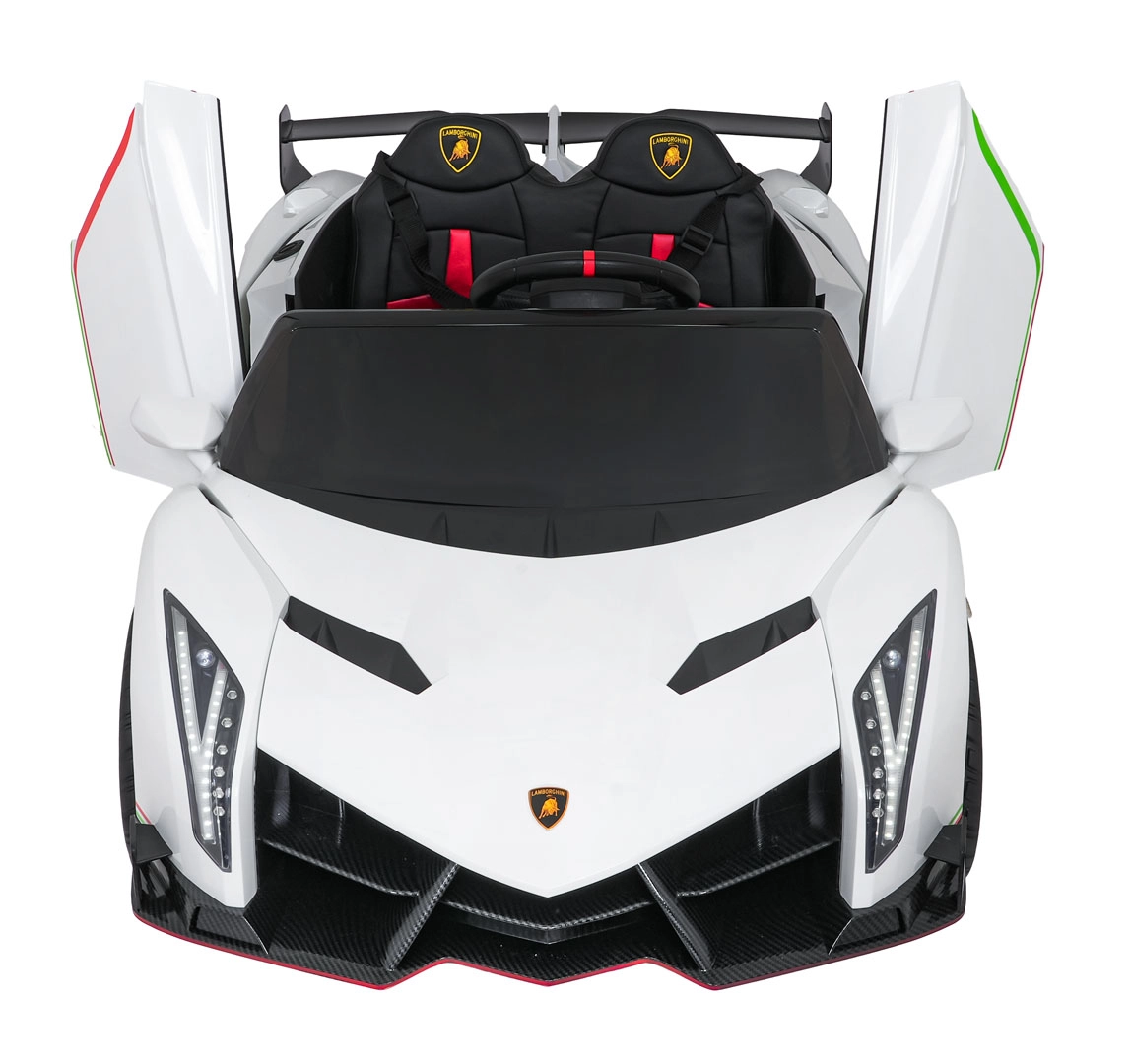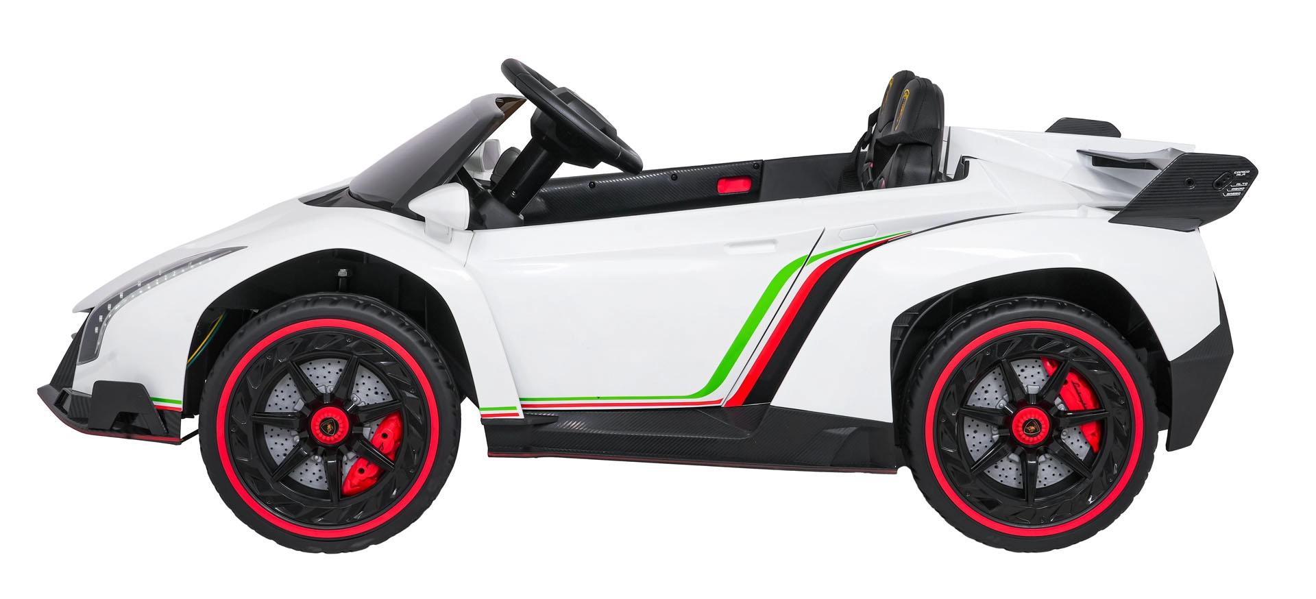 A stylish electric toy for kids inspired by the supercar LAMBORGHINI VENENO, featuring 4×45 W motors, a dual 12 V battery, scissor doors, front and rear LED lights, soft EVA wheels, and a leather seat with safety belts. Parents will appreciate the 2.4 GHz remote control with emergency STOP, while kids will love the Bluetooth/MP3/USB and FM radio.