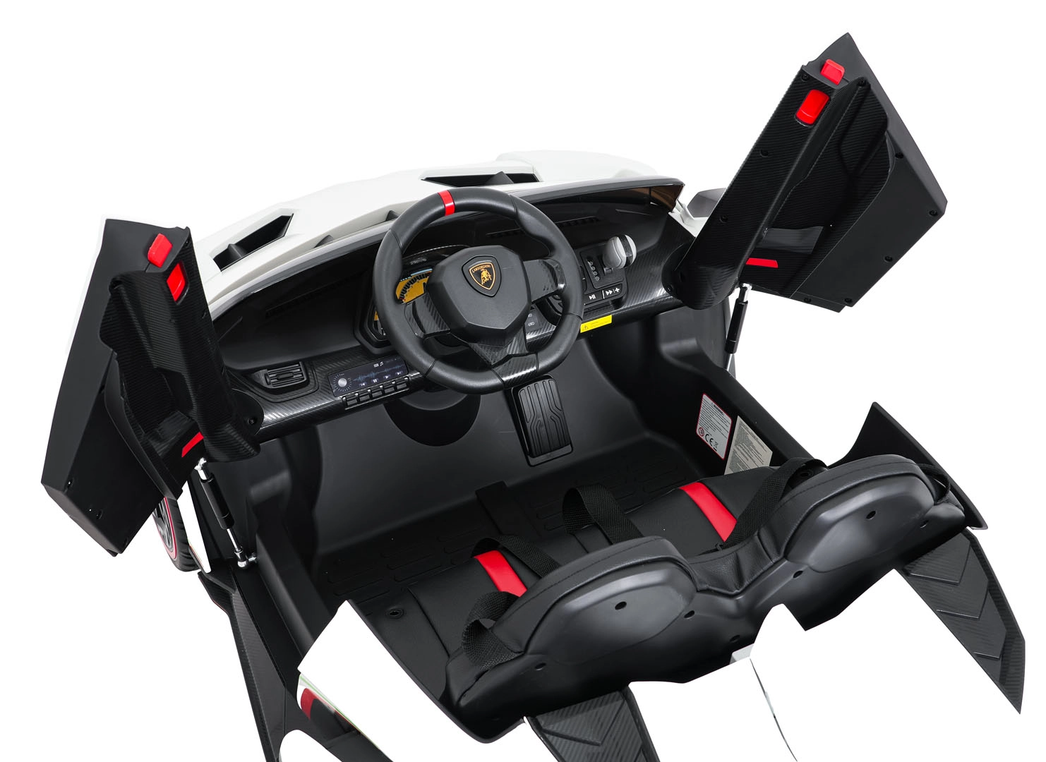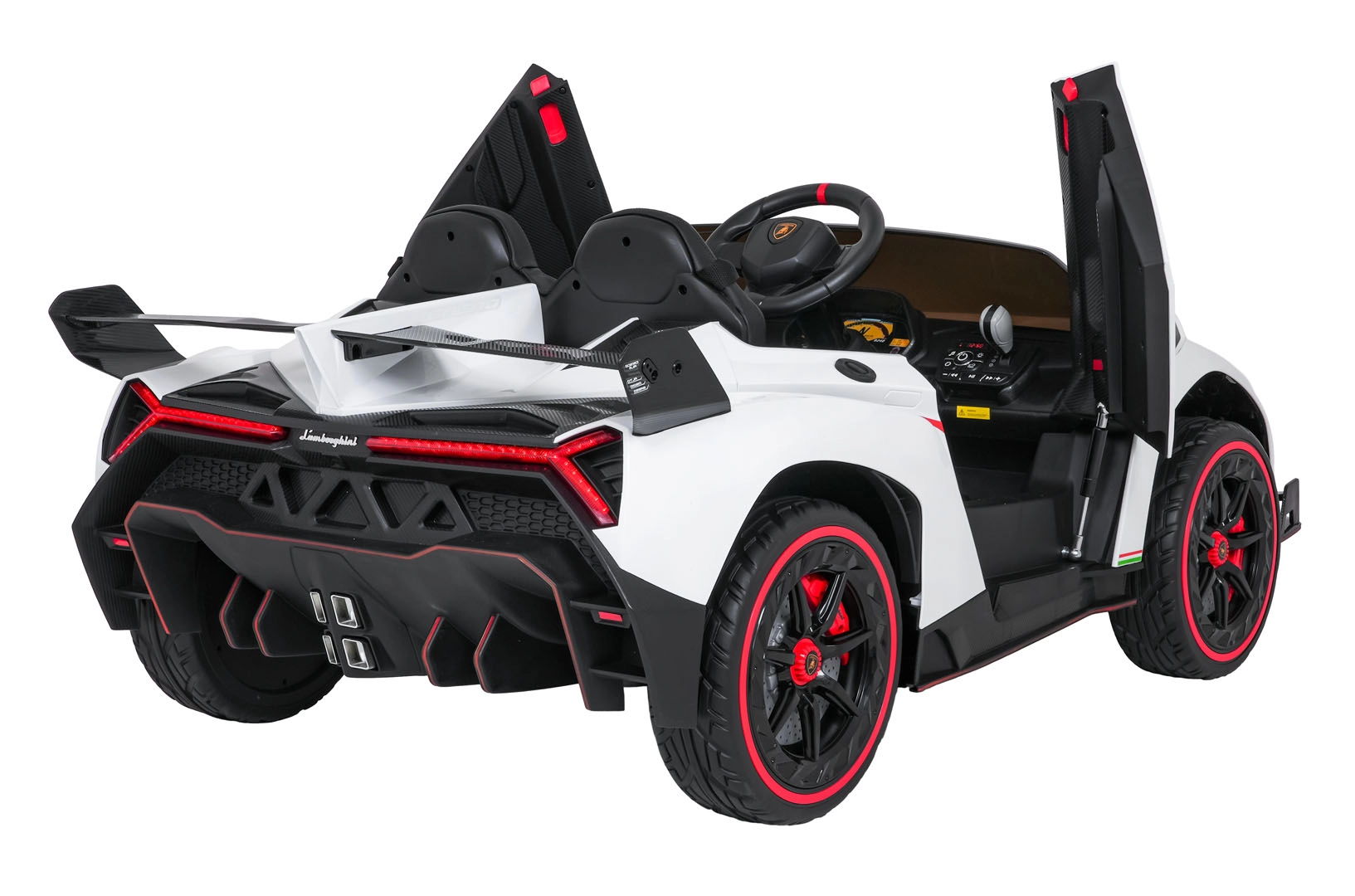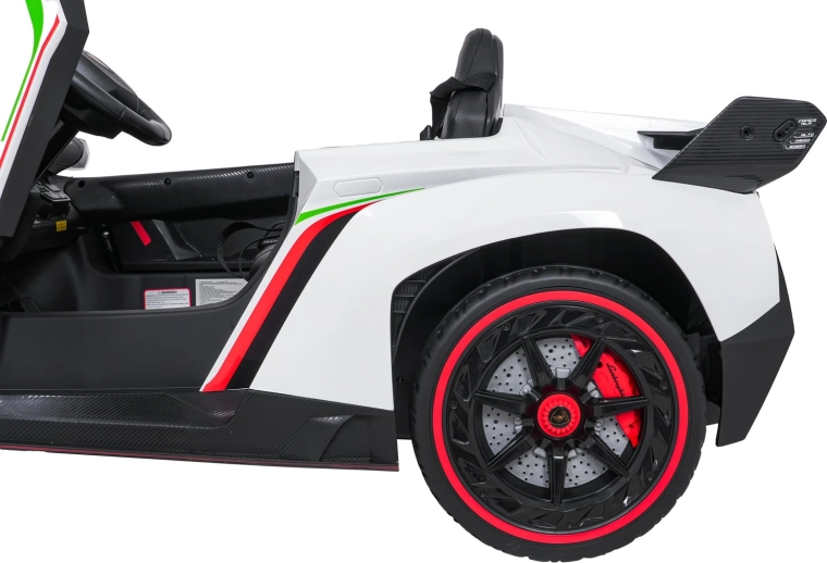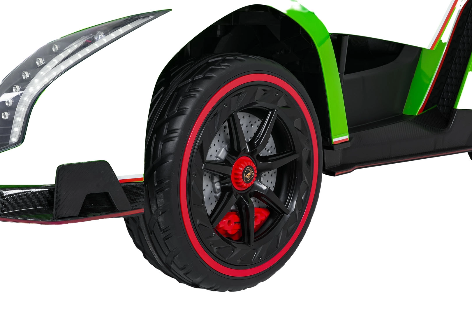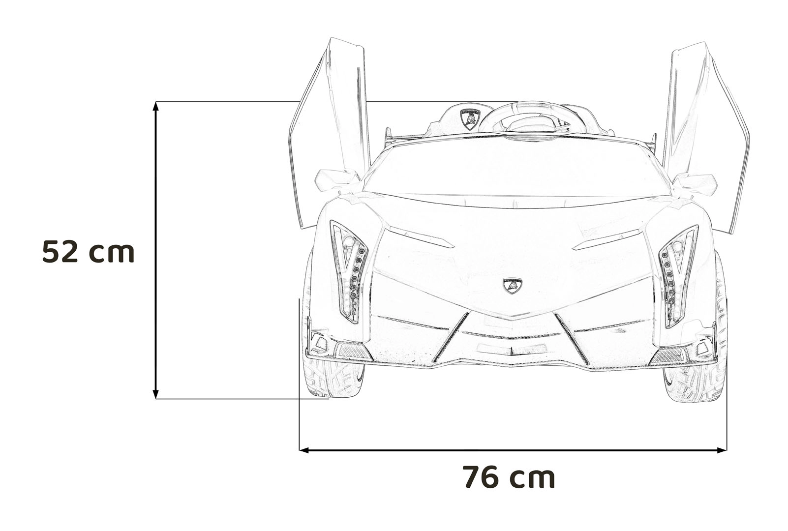 A stylish electric toy for kids inspired by the supercar LAMBORGHINI VENENO, featuring 4×45 W motors, a dual 12 V battery, scissor doors, front and rear LED lights, soft EVA wheels, and a leather seat with safety belts. Parents will appreciate the 2.4 GHz remote control with emergency STOP, while kids will love the Bluetooth/MP3/USB and FM radio.