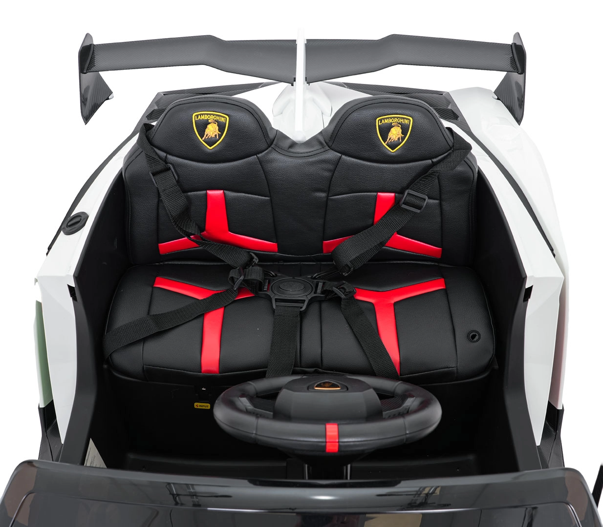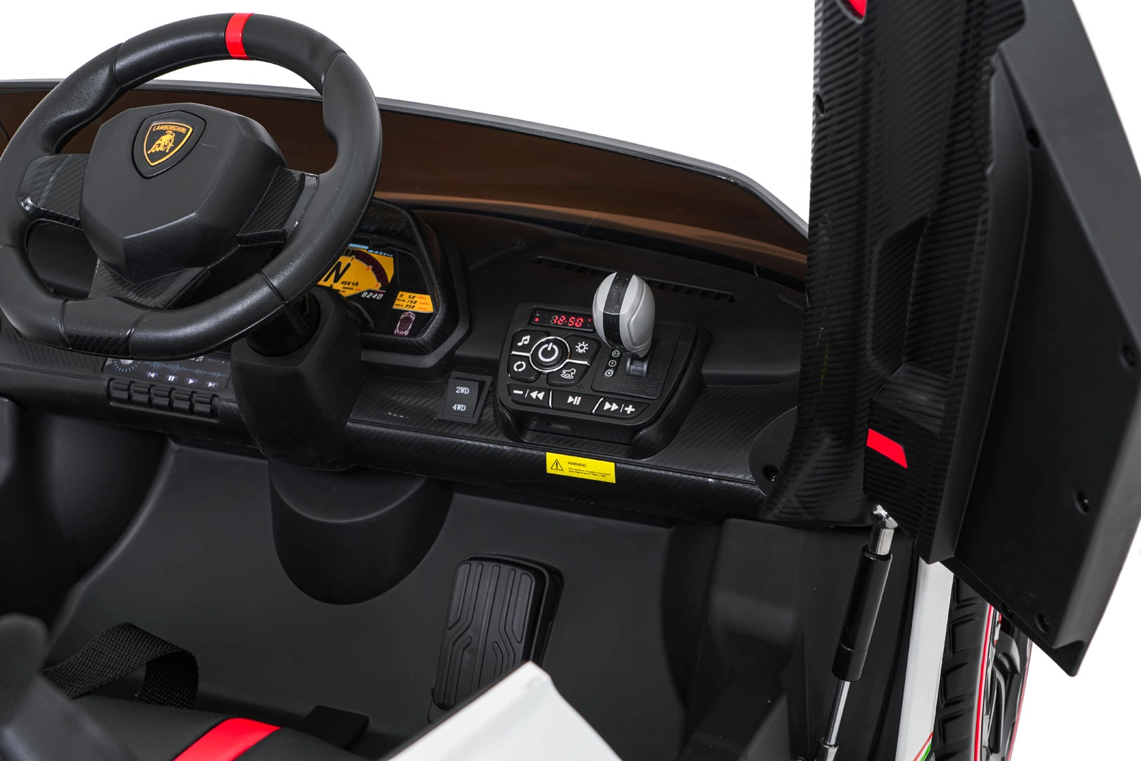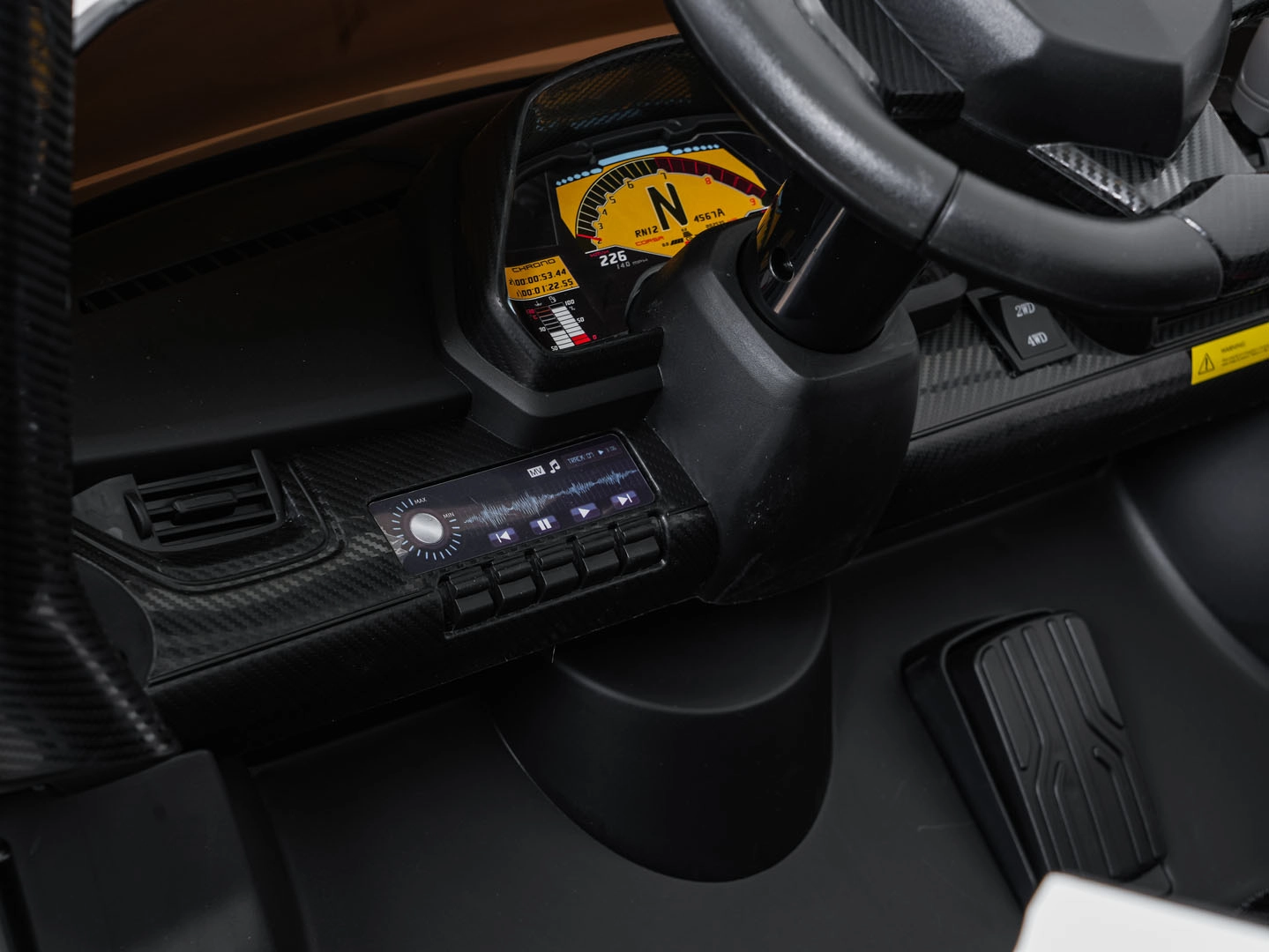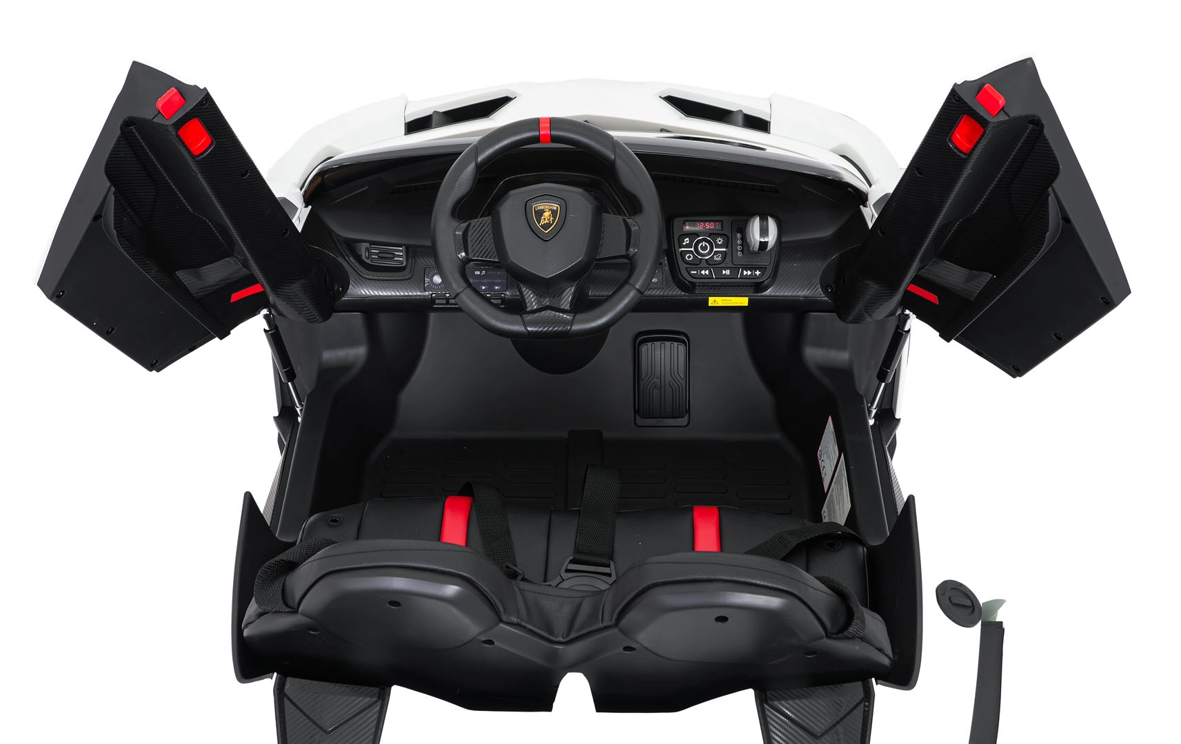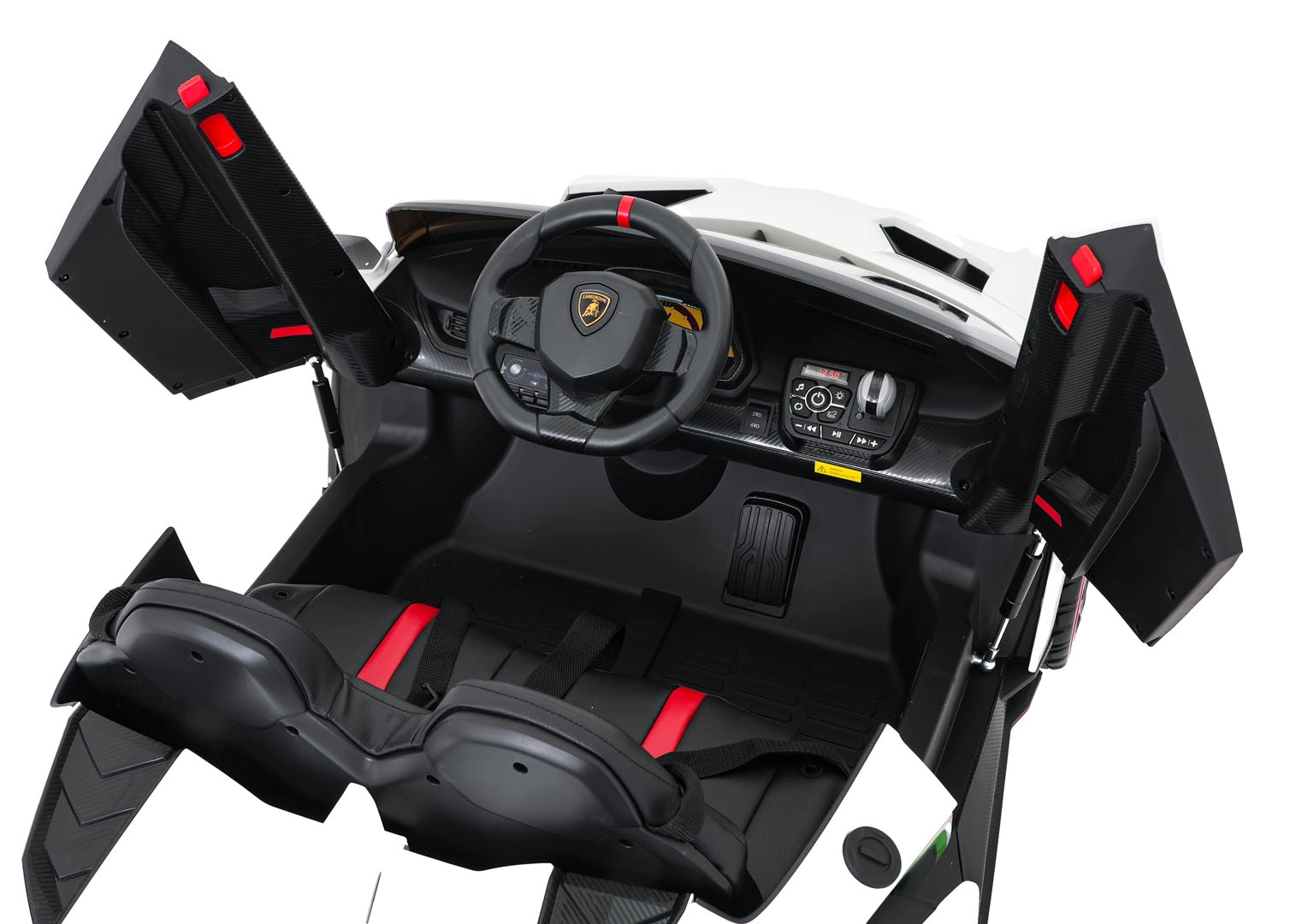 A stylish electric toy for kids inspired by the supercar LAMBORGHINI VENENO, featuring 4×45 W motors, a dual 12 V battery, scissor doors, front and rear LED lights, soft EVA wheels, and a leather seat with safety belts. Parents will appreciate the 2.4 GHz remote control with emergency STOP, while kids will love the Bluetooth/MP3/USB and FM radio.