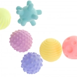 The set includes six balls with various structures: small and large bumps, indentations, grooves, and hedgehog-like spikes. It teaches coordination, color and shape recognition, and provides a relaxing massage that soothes and prepares the child for sleep.