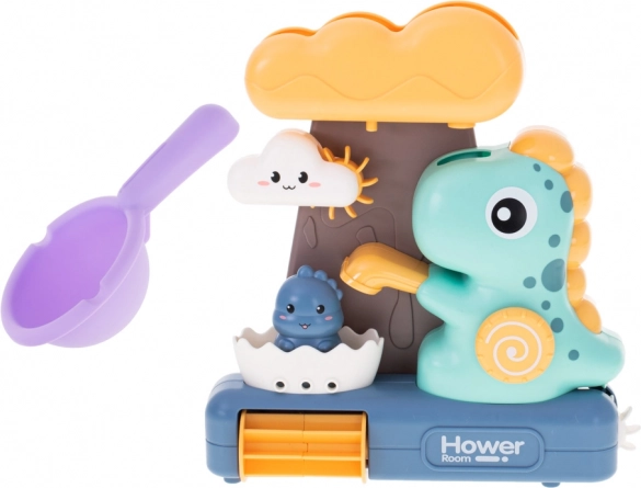 The children's bath toy with dinosaurs and water wheel is a great way to enrich the bathing experience of young children. The game involves pouring water into the top container shaped like a large cloud, from where the water naturally flows through all parts of the toy, providing visual entertainment for children.