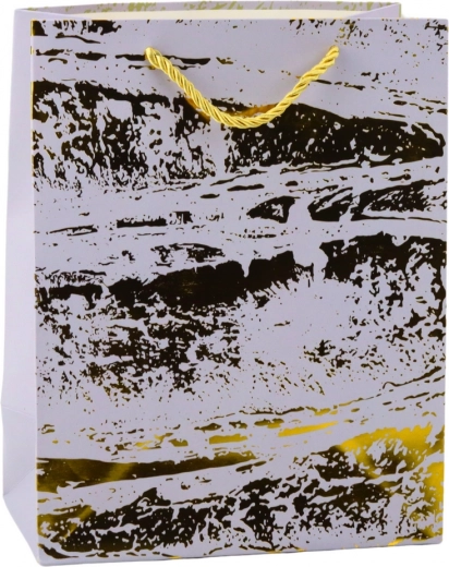 This elegant and timeless gift bag in a silver shade with an irregular golden pattern is a stylish wrap that attracts attention and enhances the special character of the gift. The golden accents beautifully sparkle under light, adding a luxurious and modern look to the bag that is sure to impress the recipient.