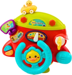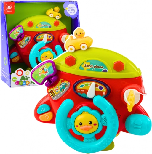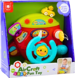 Interactive airplane dashboard has everything your little pilot needs — a steering wheel, key, functional buttons, direction-changing lever, and a miniature key. When pressing the buttons, the toy emits cheerful sounds, melodies, and light effects that support the child's sensory development.