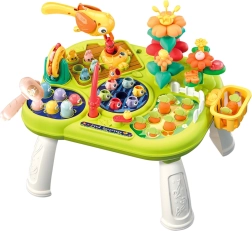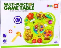 The table offers various functions that stimulate curiosity and support experimentation. It includes games like "catch the mole," interactive buttons, colorful flowers, rotary elements, levers, and gears. It helps children understand cause and effect, teaching precise finger and hand movements. It is thus not only a source of entertainment but also supports natural cognitive and manual development.