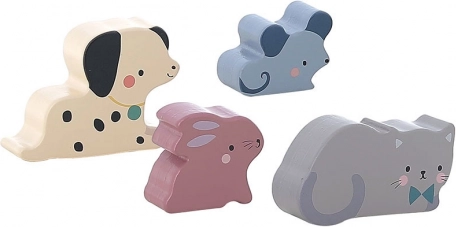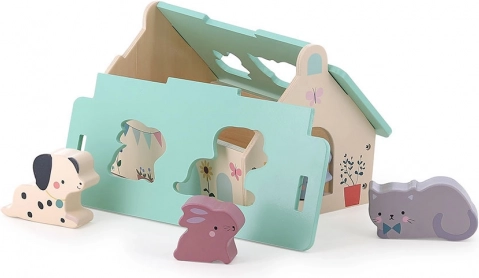 Discover the quaint wooden house by Sarah Betz with inserted animals like a dog, mouse, cat, and rabbit. This Montessori-inspired toy enhances a child's dexterity, coordination, and imagination.