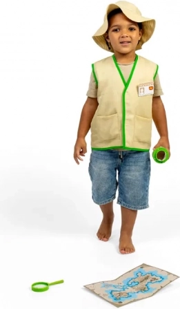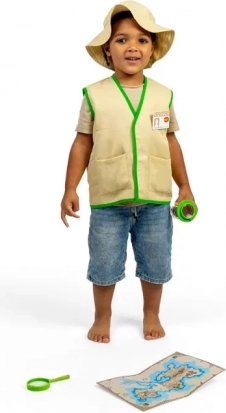 The explorer costume is ideal for developing imagination and creativity. It includes a vest, hat, name tag, detailed map, magnifying glass, wooden fossils, compass, and a special magnifier for observing insects, ensuring great fun and learning.