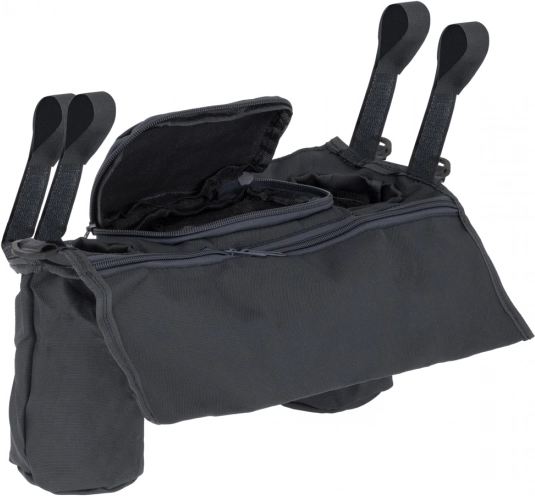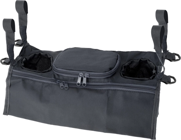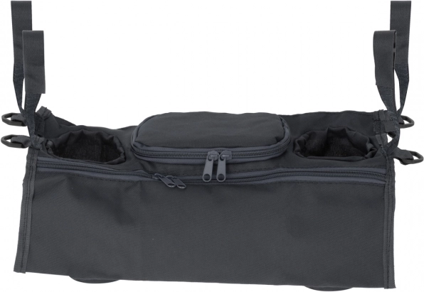Simple fastening with hook-and-loop straps on the sides keeps the organizer stable on the handle. Two spacious drink compartments with a diameter of about 7 cm and additional pockets for small items provide plenty of space for everything you need at hand.