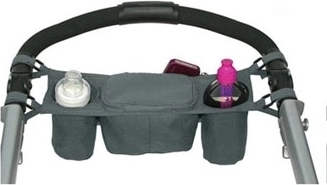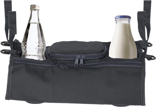 A practical stroller organizer in a universal gray color keeps all essentials within easy reach. It offers multiple pockets, insulated bottle holders, and secure attachment with hook-and-loop straps. Ideal for a milk or water bottle, diapers, wipes, and your phone.