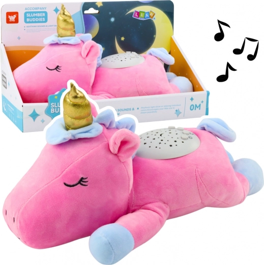 The plush pink unicorn with a projector is a cute and functional toy that captures attention with its gentle pink design with stars and moons on its ears and legs. The eyes are made of shiny plastic and the nose is embroidered, adding uniqueness.