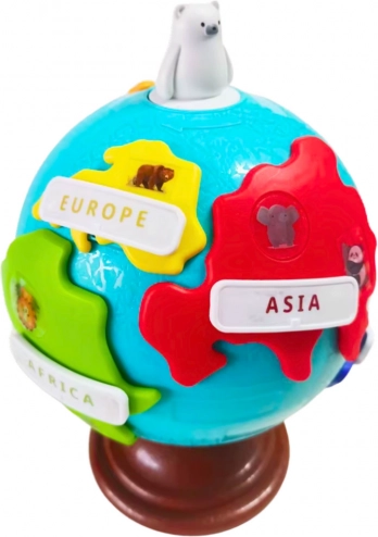 The interactive globe, a colorful rotating globe, is designed to promote child development through touch, movement, and shape recognition. Children learn through play as they try to match colored continents to the correct place, aiding logical thinking and spatial perception.