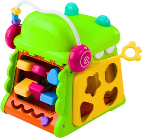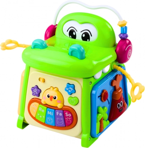 The interactive crocodile cube is equipped with a piano with color keys 'Do, Re, Mi, Fa, So', movable components for manipulation, and a clock with movable hands. Each side of the cube offers different activities, which keeps the child's interest for a longer time. Thanks to its rounded edges and large components, the toy is safe and supports the development of manual skills.