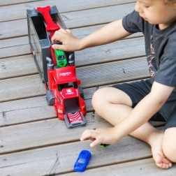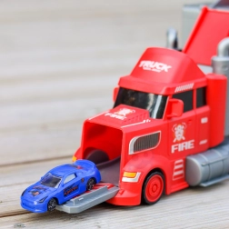 This multifunctional truck in an eye-catching firefighter design serves as a transport tractor unit, and when unfolded it turns into a complete play set with a garage, parking spots, and a dynamic track. Thanks to the car launcher, kids can start races in seconds.