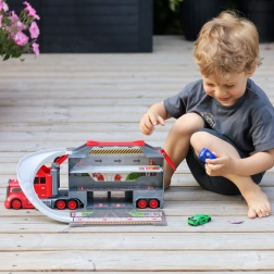 - 2-in-1: car transporter + fold-out garage with racetrack