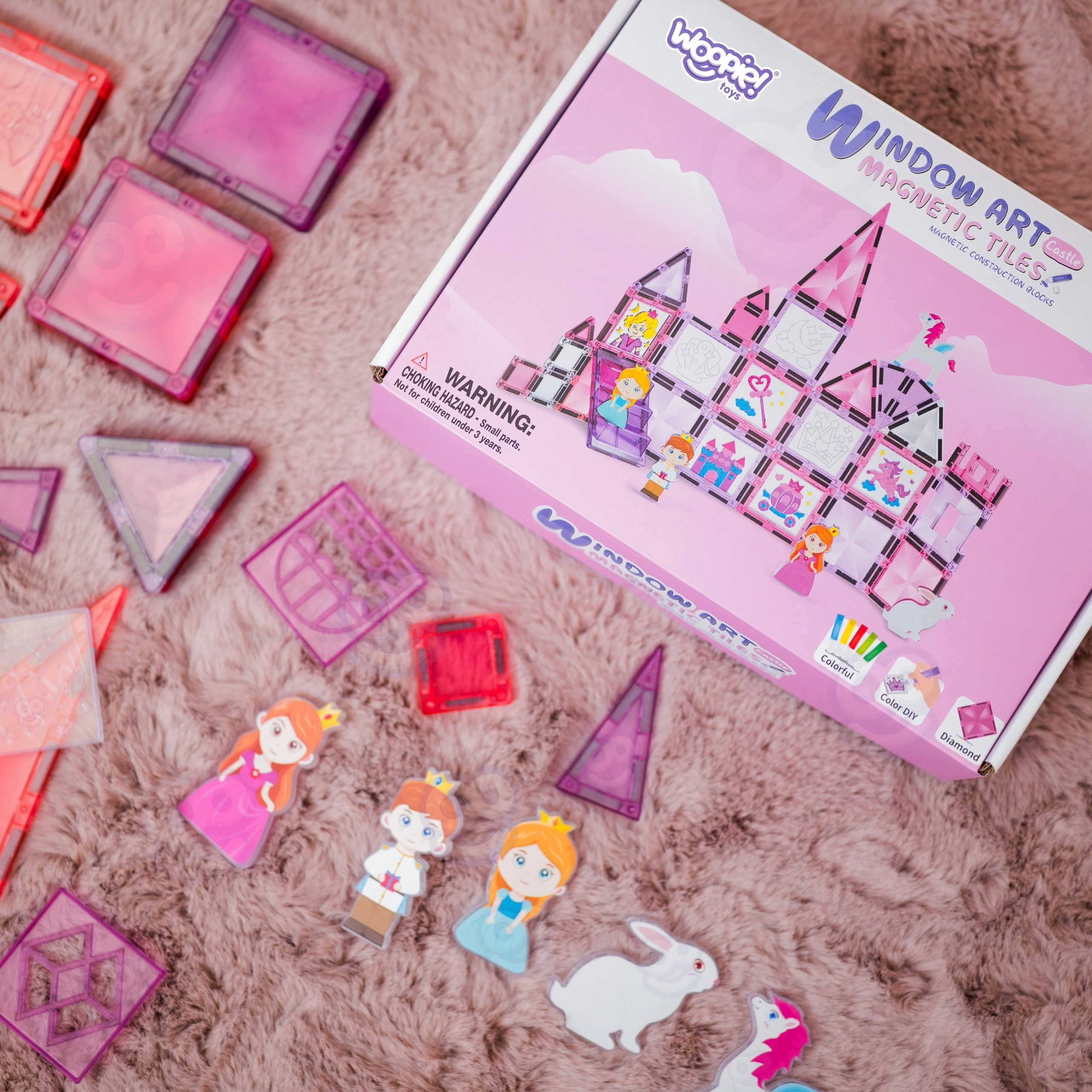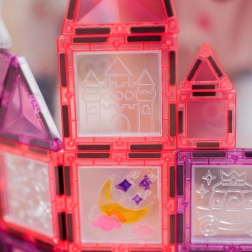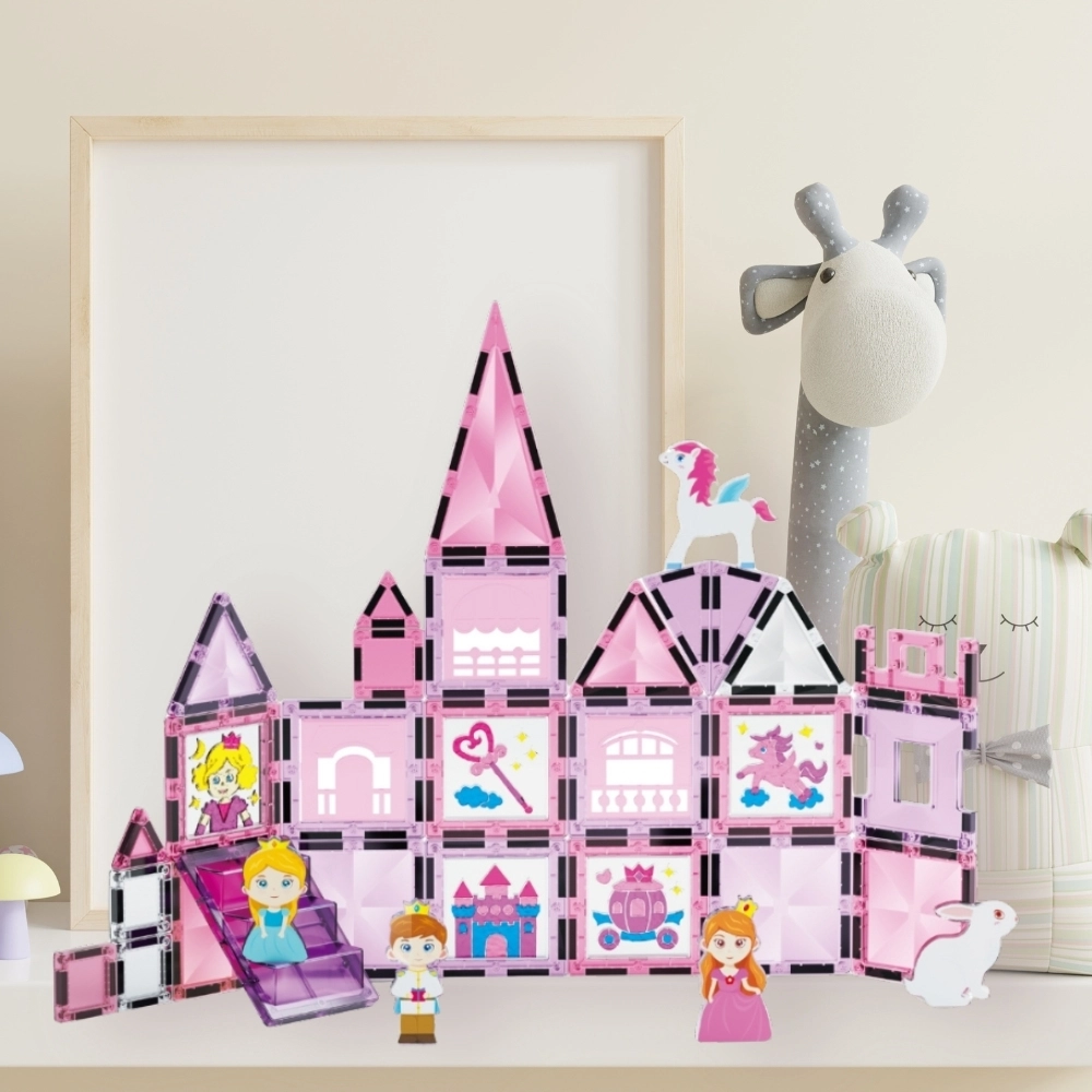 This pink-and-purple set of magnetic tiles and accessories turns children’s imagination into real palaces, towers, and gates. Pieces with windows, roofs, and decorative prints connect easily thanks to strong magnets, so structures hold their shape and kids can play without frustration.