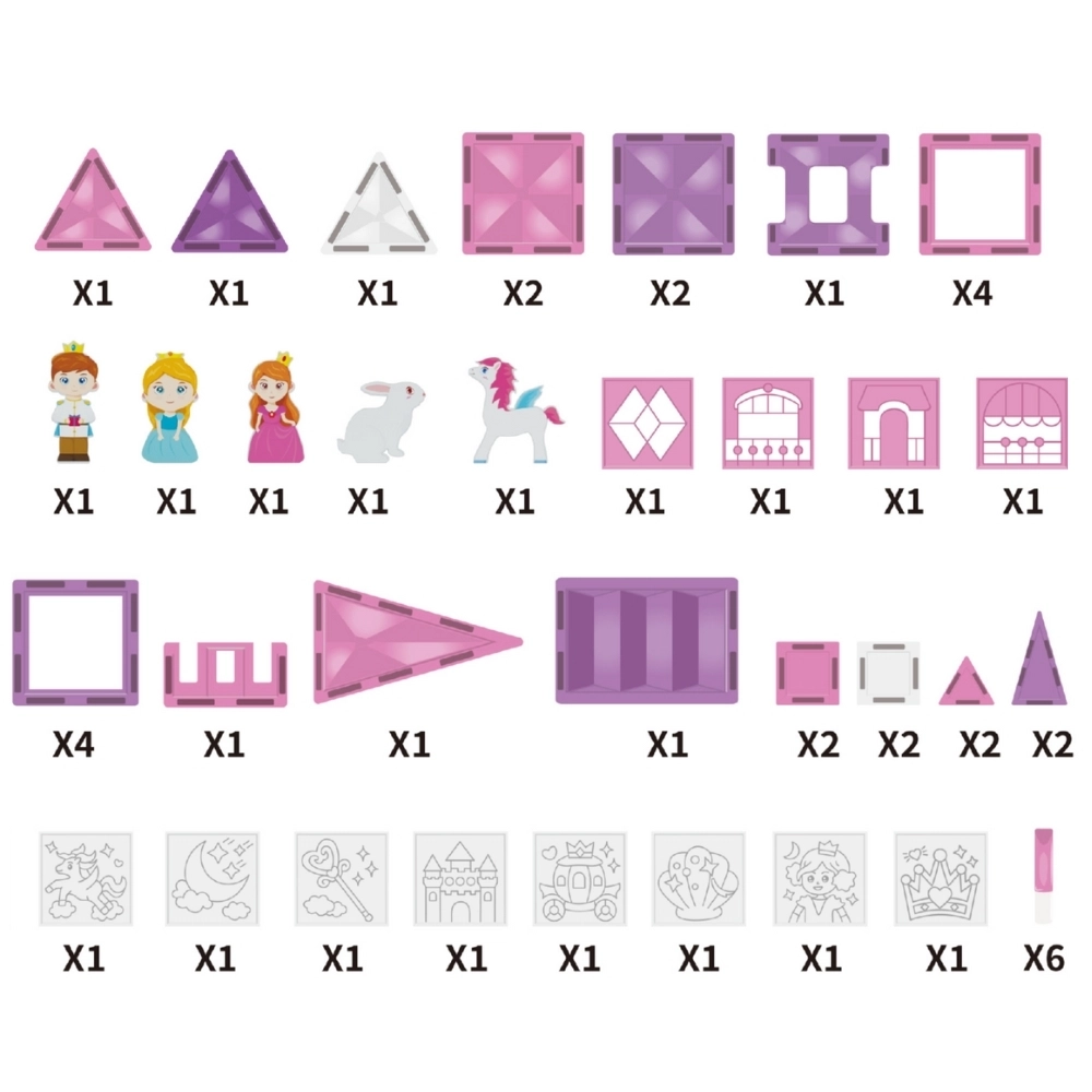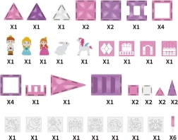Magnetic tiles in various shapes, windows and roofs, figures (princess, prince), unicorn, decorative panels