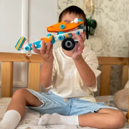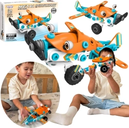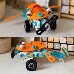 The colorful airplane construction set from Woopie is a great choice for little builders. Kids assemble the model themselves from individual parts with a movable wheel and propeller, using the included tools and stickers. The toy supports fine motor skills, logical thinking, and basic technical abilities, and is made of durable plastic and soft rubber for safe play.