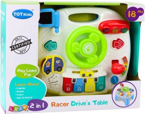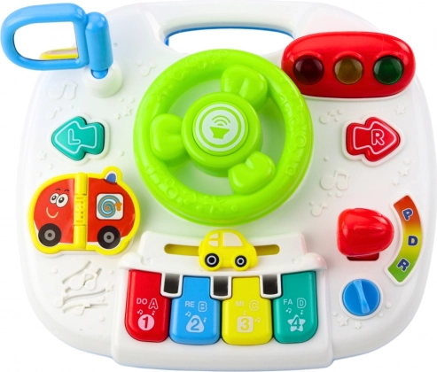 The panel includes many moving and interactive elements: a steering wheel with a horn, light signals, piano keys do-re-mi-fa, a rotary knob for adjusting the sound, a book with vehicle pictures, a mirror, a moving gear lever, a toy car, and other colorful buttons. By pressing the buttons, the child will hear car sounds, songs, cheerful melodies, and will also trigger light effects.