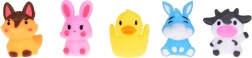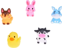 The set includes: 5 rubber farm animal figures, each in a different color (rabbit, cow, dog, duck, donkey) with dimensions approximately 5 cm x 4 cm x 4 cm. The toy is made from safe, rubber materials that are friendly to sensitive children's skin. Easy to maintain and very durable, ensuring they last a long time.