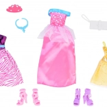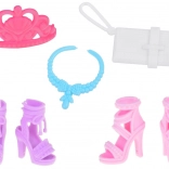 The ANLILY fashion outfit set is perfect for children who love style and design. It includes three different dresses - each with a unique cut and color, two elegant pairs of high-heeled shoes, a stylish bag, a blue necklace, and a delicate crown perfect for any little princess.