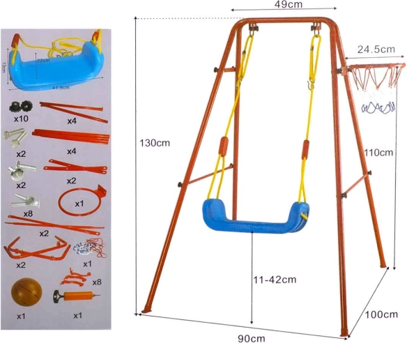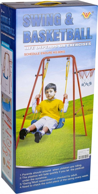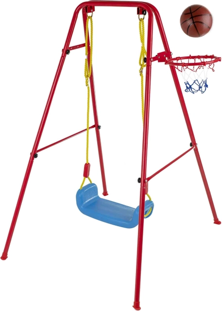 Give kids active outdoor fun with a combo swing and basketball hoop. The robust metal frame, comfortable plastic seat, and durable ropes ensure safe swinging, while the included basketball hoop with a ball and pump expands play options. Easy assembly, up to 80 kg capacity, and vibrant colors will delight children and parents alike.
