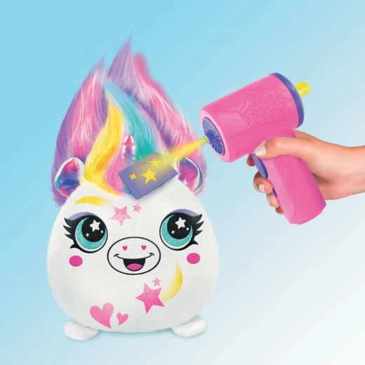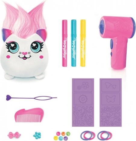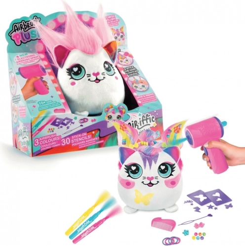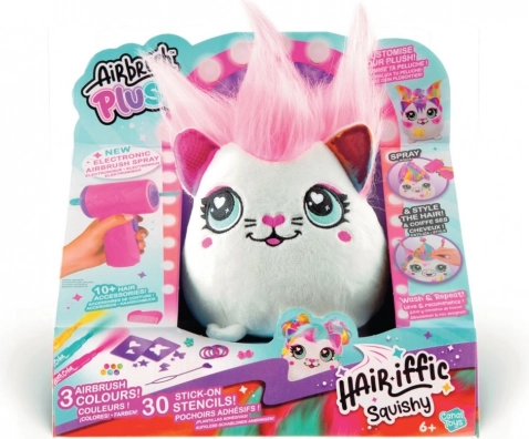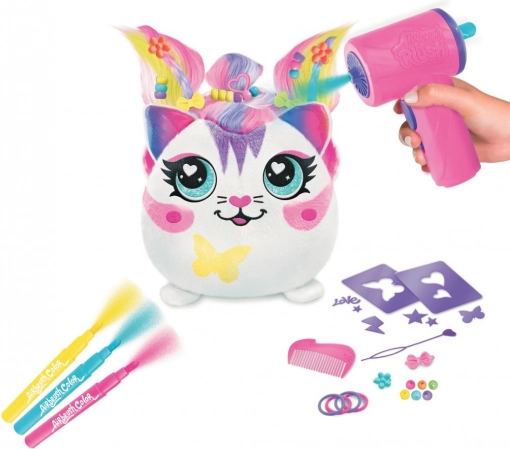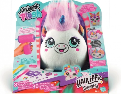 In this unique set you will find a plush with hair, a battery-operated airbrush tool, three markers, and thirty stencils for unlimited decorating possibilities. After washing according to instructions, you can start again and create a new design.