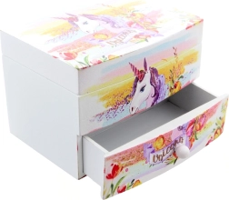 Wooden jewelry box with a unicorn motif, which is not only a design element for a child's room but also a practical storage for little treasures. It is a perfect gift for children that will delight them with its charm.
