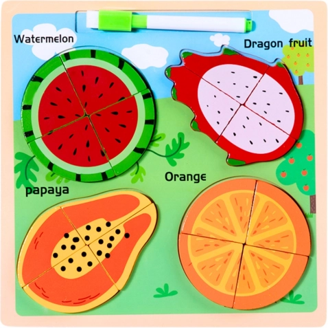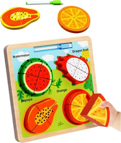 The wooden educational puzzle with fruit motifs is a perfect toy for developing coordination and logical thinking in children. It includes four beautiful fruit pieces: watermelon, pitaya, papaya, and orange. Each piece is divided into several parts that need to be assembled, offering both a challenge and fun.