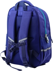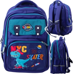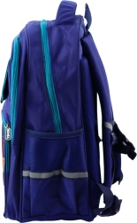 The backpack is made of durable material and is designed to withstand everyday use. It features a spacious main compartment with an internal divider for organized storage of books and notebooks. There is also a smaller compartment, a front zip pocket, and a small flap pocket with Velcro. Mesh pockets on both sides of the backpack are ideal for a bottle or canteen.