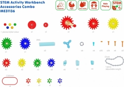 The set includes a rich selection of gears, an adjustable-length chain, a belt for moving constructions, pulleys, screws, nuts, and tools including a drill, screwdriver, saw, and hammer. Compatible with other MASTERKIDZ STEM add-ons, the workstation can be easily expanded.