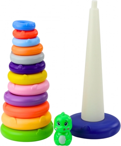 This toy consists of a sturdy and stable base, a tall pole, and 13 colorful rings of various sizes. All elements are made from lightweight and durable plastic, which is safe for small children. The top part of the tower is adorned with a cute dinosaur figure that captures children's attention and encourages further play.