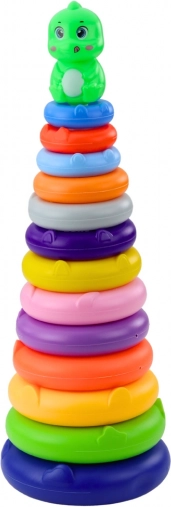 Colorful children's tower with dinosaurs and 13 rings. Develops motor skills and coordination.