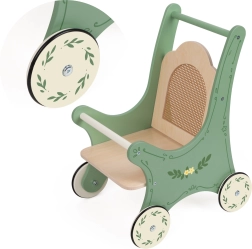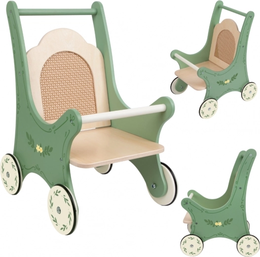 Wooden Doll Stroller - Vintage Style with Rattan Backrest! Enjoy a unique retro atmosphere with a green frame adorned with floral ornaments and a rattan backrest. An ideal toy for children who love to care for their dolls and plush toys.