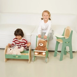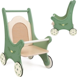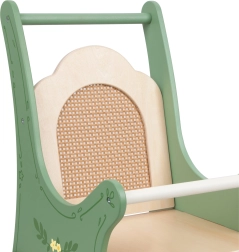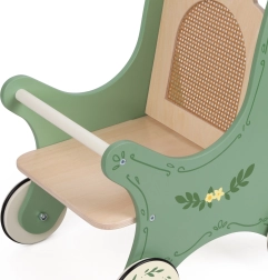 This charming doll stroller combines classic style with natural materials. Its green frame, decorated with floral ornaments and a rattan backrest, draws attention and creates a unique retro style. Perfect for little children who love role-playing as caregivers.