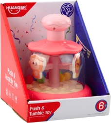 By pressing the pink button on top, the carousel spins and the animals begin to revolve around their axis, creating a dynamic and colorful carousel. This toy engages a child's sight, hearing, and movement, thereby developing hand-eye coordination and understanding of causality.