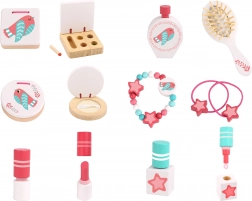 - The set includes wooden accessories: nail polish, lipstick, bracelet, earrings, hairbrush, perfume, powder box, and eyeshadow.