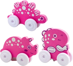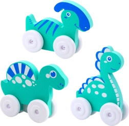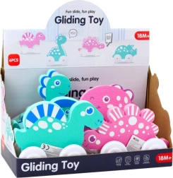 Colorful dinosaurs on wheels are designed for kids' enjoyment. They have a friendly appearance, rounded shapes, and pastel colors that spark imagination. Thanks to the wheels, the toys move easily, and the lightweight construction allows children to easily push them and take them anywhere.