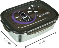 Snack Box with Wednesday motif offers a capacity of 550 ml, ideal for lunches and snacks. Made of stainless steel with a transparent lid, it is durable and practical.