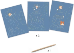 The set of DJECO Wardrobe scratch-off pictures is an ideal way to entertain children while encouraging their creativity. Scratch-off technique allows children to reveal beautiful patterns and colors hidden beneath a special layer. This set includes: