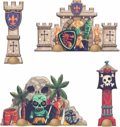 - Sturdy cardboard, double-sided pieces, stable 3D scenery, easy box storage
