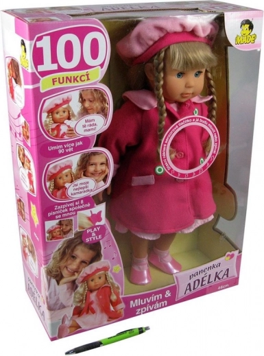 Doll Adélka offers 100 functions of entertainment in a stylish fashion outfit. It speaks Czech sentences, sings traditional songs, and also laughs.