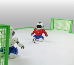 Experience the excitement of a football match with Robofootball, where two robots compete in the art of driving the ball into the opponent's goal. Each robot is controlled by a separate remote, which ensures maximum control over their movements and actions.