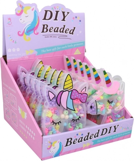 Beads in Unicorn Box encourage children's creativity, ideal gift for girls. Dimensions 15x10 cm, plastic material.