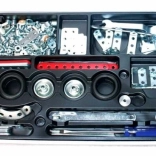 The kit contains 230 metal parts including screws, nuts, and other components organized in a black compartment.