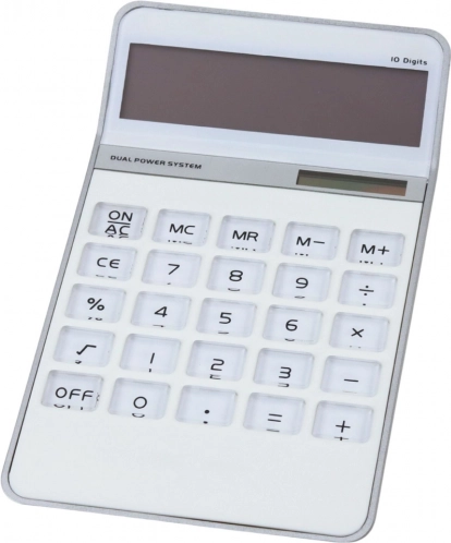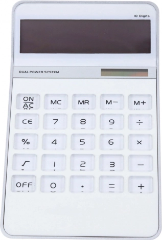 A modern office calculator in an elegant white casing that combines aesthetics and functionality. Its minimalist design and prominently marked buttons make it perfect on any desk – in the office, at home, or in educational spaces.