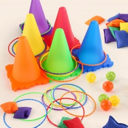 - 3 games in 1: balls into cones, beanbag toss, ring toss