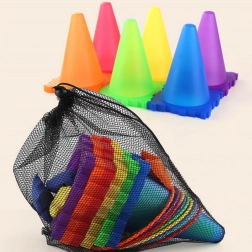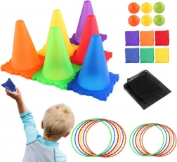 - 6 plastic cones; 6 rings Ø 14 cm; 6 rings Ø 16 cm; 6 soft throwing beanbags; 6 plastic balls; mesh carry bag