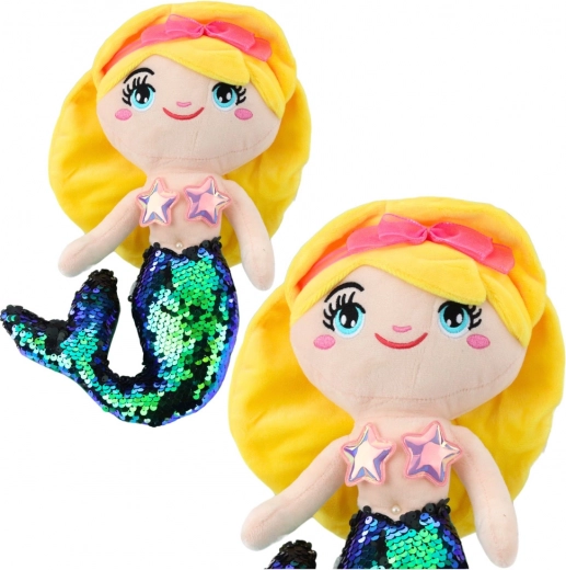 This toy features large embroidered eyes, a smiling face, yellow hair adorned with a pink bow, and an impressive tail covered with glitter. The glitter changes color from green to black when you run your hand over it, bringing joy to the child and stimulating their tactile senses and imagination.